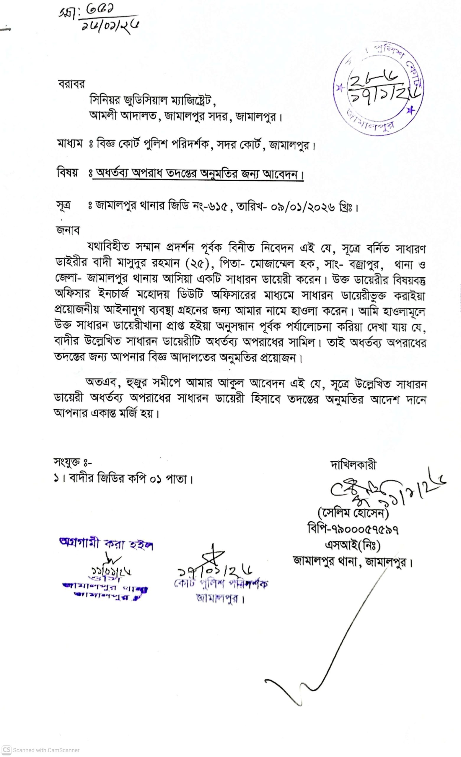 জামালপুর প্রতিনিধি : দৈনিক জনবাণী ও দৈনিক আলোচিত জামালপুর পত্রিকার স্টাফ রিপোর্টার এবং দৈনিক সংবাদ সারাবেলা পত্রিকার জামালপুর জেলা প্রতিনিধি সাংবাদিক মাসুদুর রহমানকে মাদক সেবী রনি মিয়া @জয় ও তার স্ত্রী অনিতা প্রাণ নাশের হুমকি দেওয়ায় তদন্তের আবেদন মঞ্জুর করেছে আদালত। সোমবার (১৯ জানুয়ারী) দুপুর ১২ টায় অতিরিক্ত চীফ জুডিসিয়াল ম্যাজিস্ট্রেট আদালত এর বিচারক সাইফুর রহমান এ আবেদন মঞ্জুর করেন।