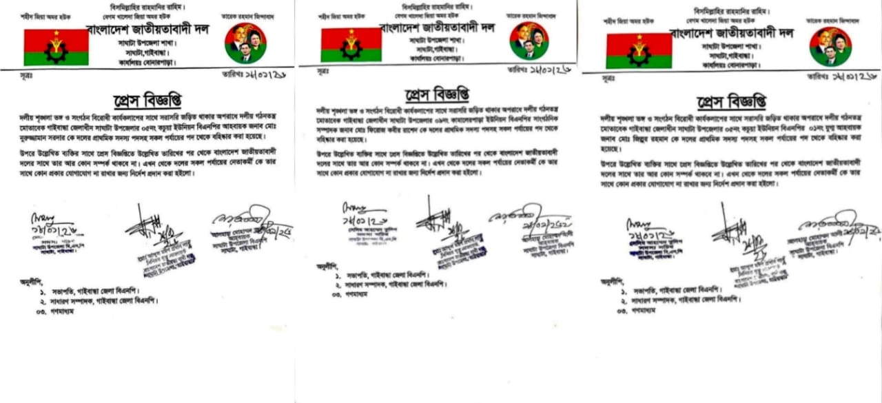 গাইবান্ধার সাঘাটায় দলীয় শৃঙ্খলা ভঙ্গে বিএনপির ৩ নেতা বহিষ্কার