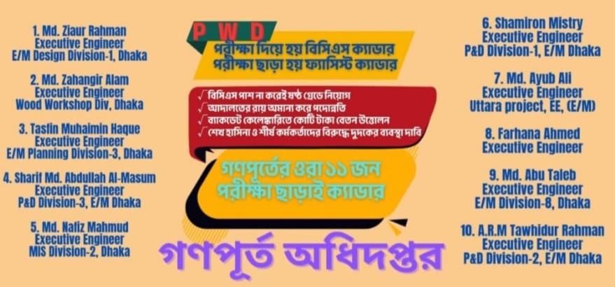 আদালতের রায় অমান্য করে বিসিএস কর্মকর্তাদের জ্যেষ্ঠতা হরণ : আদালতের নির্দেশে ১৭ জন বিসিএস কর্মকর্তার পদ সংরক্ষণের আদেশ থাকলেও গণপূর্ত অধিদপ্তর ও মন্ত্রণালয় তা কার্যকর করেনি। বরং অবৈধভাবে নিয়োগপ্রাপ্তদের বিসিএস কর্মকর্তাদের ওপরে জ্যেষ্ঠতা দেওয়া হয়েছে।