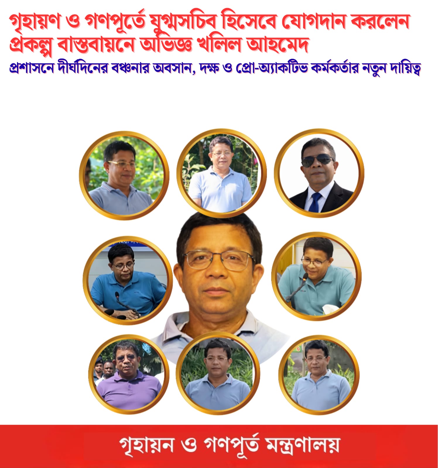নিজস্ব প্রতিবেদক : গৃহায়ণ ও গণপূর্ত মন্ত্রণালয়ে যুগ্মসচিব (পরিকল্পনা ও উন্নয়ন অধিশাখা–৩) হিসেবে যোগদান করেছেন বিসিএস (প্রশাসন) ক্যাডারের অভিজ্ঞ কর্মকর্তা খলিল আহমেদ (৬৭১৮)। জনপ্রশাসন মন্ত্রণালয়ের ৩ নভেম্বর ২০২৫ খ্রি. তারিখের প্রজ্ঞাপনে তাকে স্বরাষ্ট্র মন্ত্রণালয় থেকে বদলি করা হয়। তিনি ৯ নভেম্বর ২০২৫ খ্রি. তারিখে আনুষ্ঠানিকভাবে দায়িত্ব গ্রহণ করেন।