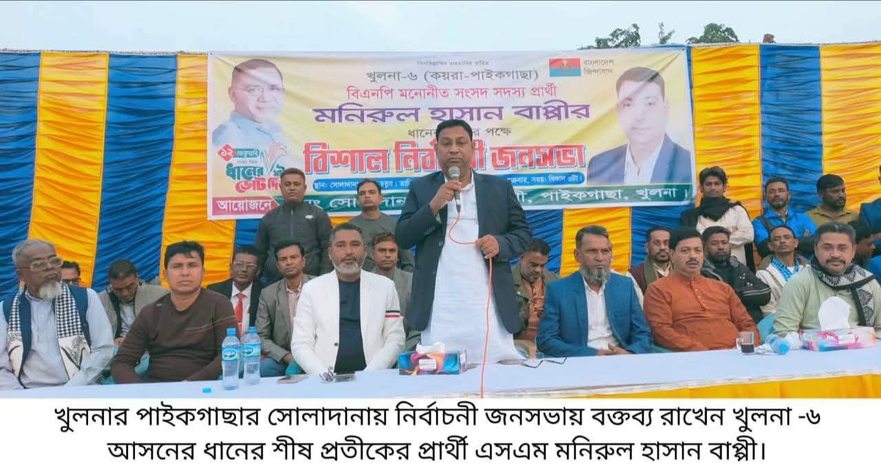 শাহরিয়ার কবির,(খুলনা) : ত্রয়োদশ জাতীয় সংসদ নির্বাচনে খুলনা–৬ (পাইকগাছা–কয়রা) আসনের বিএনপির প্রার্থী এসএম মনিরুল হাসান বাপ্পী বলেছেন, উপকূলীয় এ জনপদের মানুষ দীর্ঘদিন ধরে অবহেলা ও বঞ্চনার শিকার। উন্নয়নের আশ্বাস দিয়ে বারবার ভোট নেওয়া হলেও পাইকগাছা ও কয়রার সাধারণ মানুষের ভাগ্যের কোনো পরিবর্তন হয়নি। এই অবহেলার জবাব আসন্ন নির্বাচনে ভোটের মাধ্যমেই দিতে হবে বলে মন্তব্য করেন তিনি।শুক্রবার (৩০ জানুয়ারি) বিকেলে পাইকগাছা উপজেলার সোলাদানা বাজার চত্বরে সোলাদানা ইউনিয়নবাসীর আয়োজনে ধানের শীষ প্রতীকের নির্বাচনী জনসভায় প্রধান অতিথির বক্তব্যে তিনি এসব কথা বলেন।