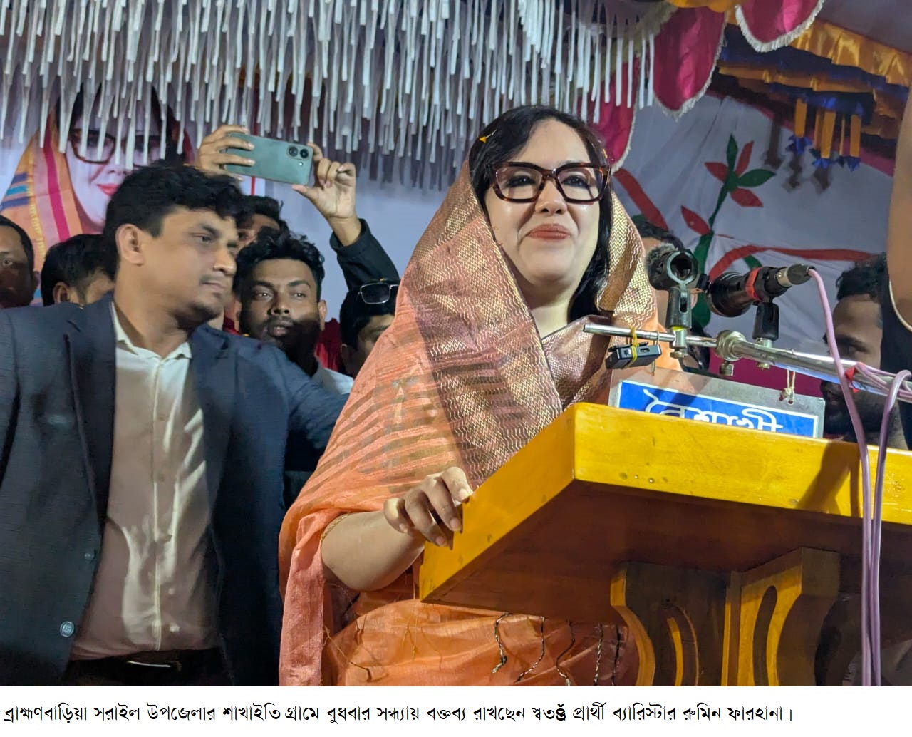 ব্রাহ্মণবাড়িয়া প্রতিনিধি : জরিপের উদ্ধৃতি দিয়ে সাবেক সংসদ সদস্য ও ব্রাহ্মণবাড়িয়া-২ (সরাইল-আশুগঞ্জ-বিজয়নগরের দুই ইউনিয়ন) আসনে স্বতন্ত্র প্রার্থী ব্যারিস্টার রুমিন ফারহানা জানিয়েছেন এবারের নির্বাচনে ৩০ ভাগ মানুষ মার্কা নয় প্রার্থী দেখে ভোট দিবেন। তিনি বলেন, ‘কেউ যদি মনে করে মার্কার (দলীয় প্রতীক) উপর চড়ে নির্বাচনের তরী পার হবে সেটা হওয়ার কোনো সুযোগ নাই।’