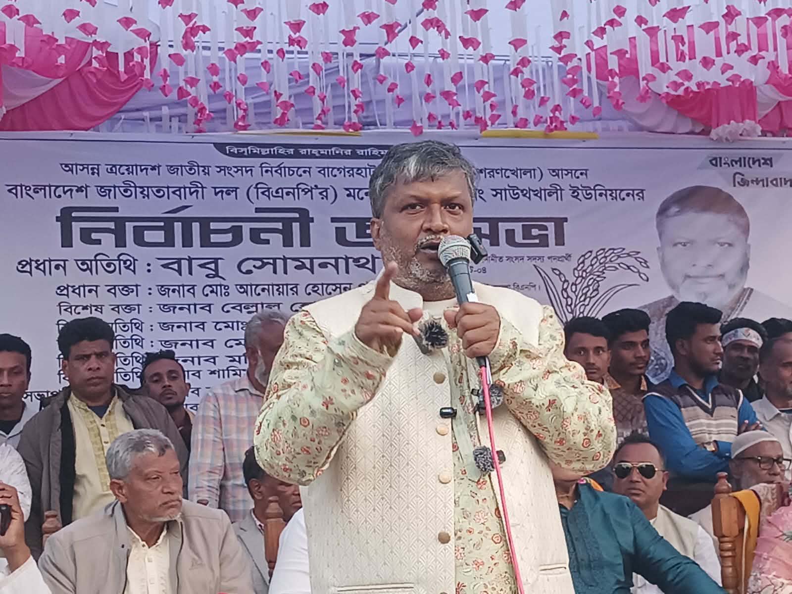 সাউথখালী ইউনিয়ন বিএনপির সভাপতি শহীদুল আলম লিটন এর সভাপতিত্বে অনুষ্ঠিত সভায় প্রধান অতিথি হিসেবে উপস্থিত ছিলেন বাগেরহাট-৪ আসনের বিএনপির মনোনীত ধানের শীষের প্রার্থী সোমনাথ দে।