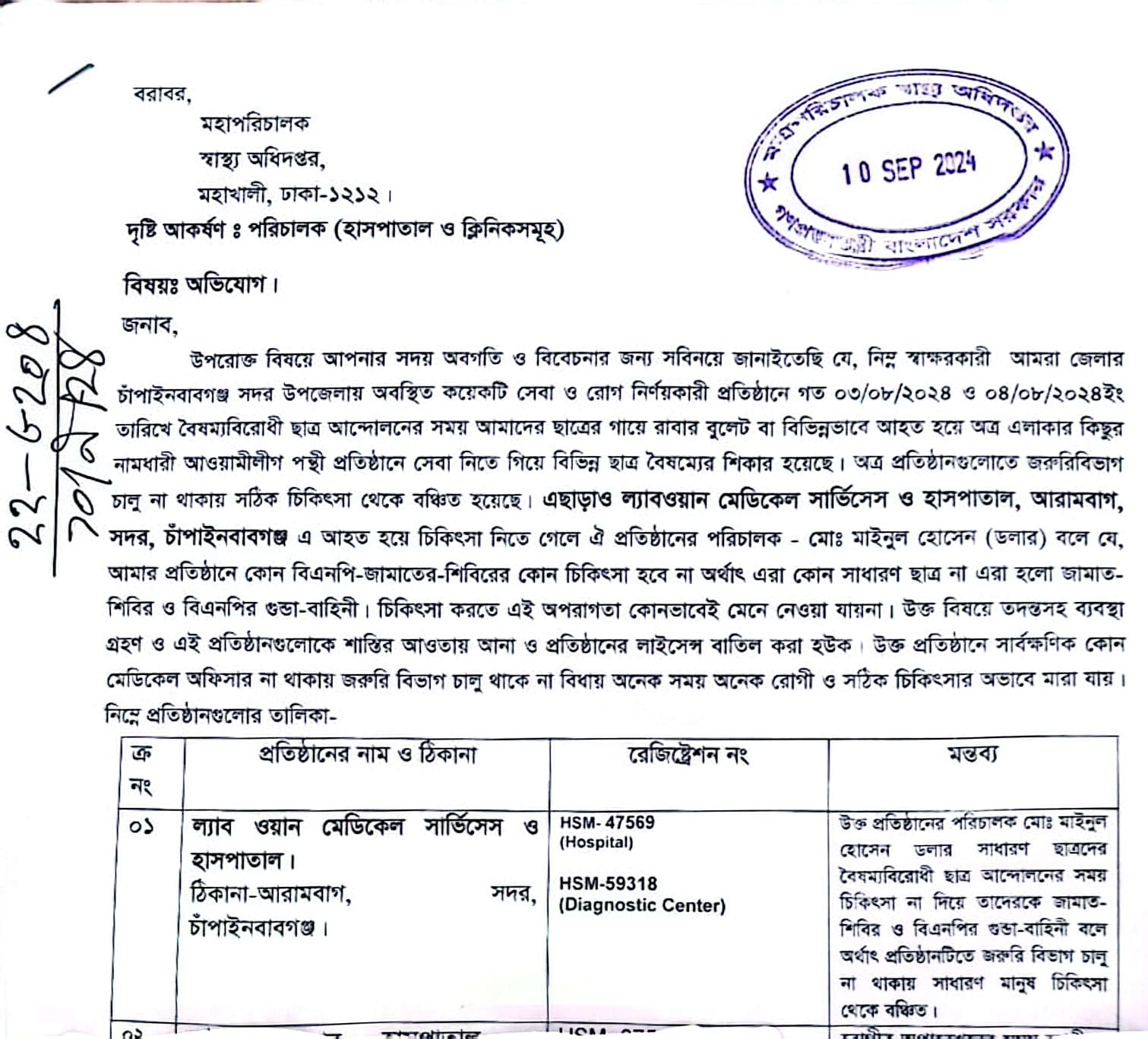 পরবর্তীতে এ প্রতিষ্ঠান ও মালিকের বিরুদ্ধে ১০-০৯-২০২৪ তারিখে মহাপরিচালক স্বাস্থ্য অধিদপ্তর মহাখালী বরাবর লিখিত অভিযোগ হলেও অভিযোগের ভিত্তিতে এখন পর্যন্ত কোন ব্যবস্থা গ্রহণ করা হয়নি, ল্যাব ওয়ান মেডিকেল সার্ভিসেস ও হাসপাতাল মালিকের বিরুদ্ধে । এ নিয়ে জুলাই যোদ্ধাদের মধ্যে একটি বড়ো ধরনের মিশ্র প্রতিক্রিয়া দেখা দিয়েছে। নাম না বলা শর্তে চাঁপাইনবাবগঞ্জ পৌরসভার মাস্টার পাড়া এলাকার একজন বলেন। এই আওয়ামী লীগ ফ্যাসিবাদের বিরুদ্ধে সচেতন হতে হবে।
