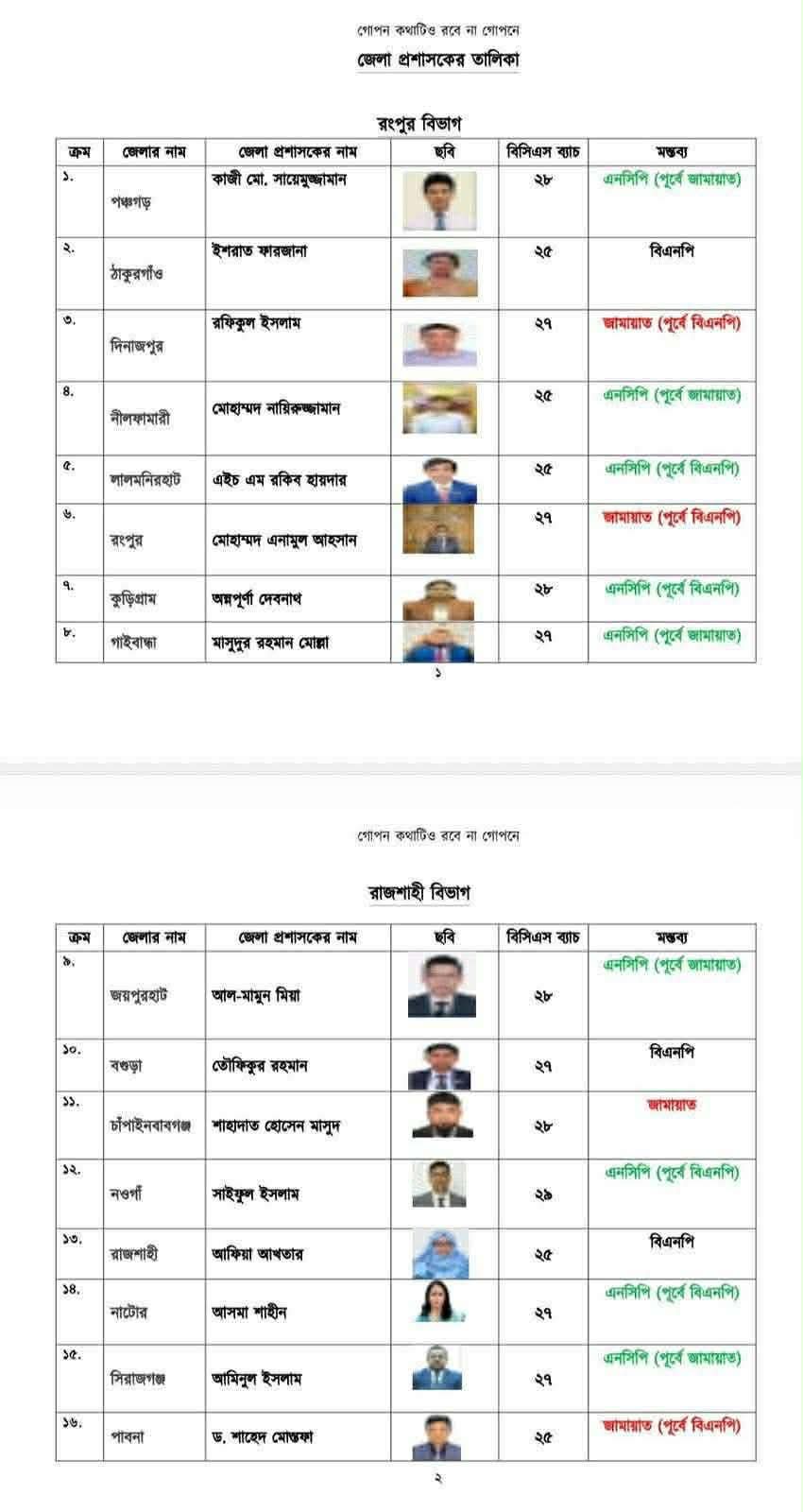 রাজশাহী ও রংপুর : বিএনপি কোণঠাসা : উত্তরাঞ্চলের রাজশাহী ও রংপুর বিভাগে বিএনপি প্রায় প্রান্তিক। এনসিপি ও জামায়াত—এই দুই শক্তির মধ্যে প্রশাসনিক নিয়ন্ত্রণ ভাগ হয়ে গেছে বলে তালিকা ইঙ্গিত দিচ্ছে। বিশেষ করে রংপুর বিভাগে—“প্রায় পুরোটাই এনসিপি ও জামায়াতের দখলে”—এই মন্তব্য রাজনৈতিক বিশ্লেষকদের নতুন করে ভাবাচ্ছে।