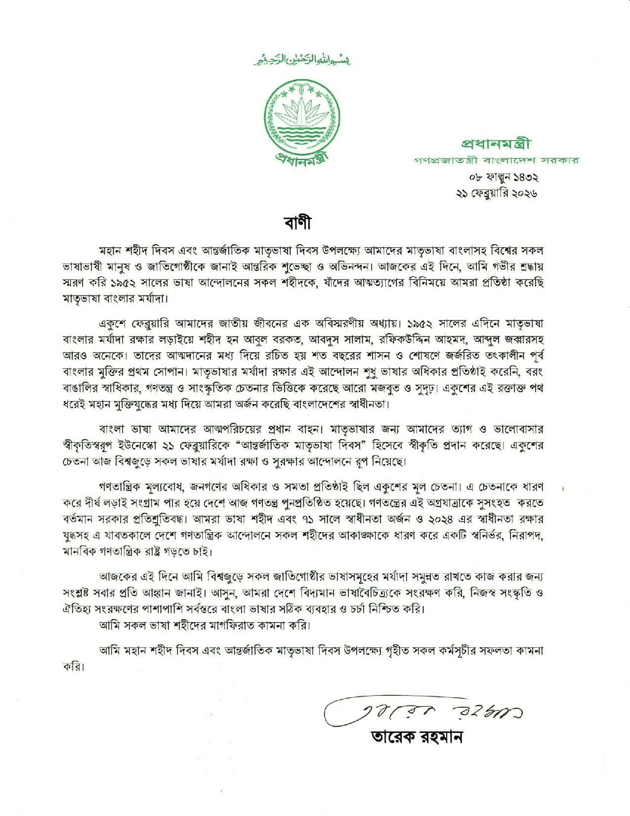 মহান শহীদ দিবস ও আন্তর্জাতিক মাতৃভাষা দিবসে গভীর শ্রদ্ধা ও অঙ্গীকারের আহ্বান প্রধানমন্ত্রী তারেক রহমানের