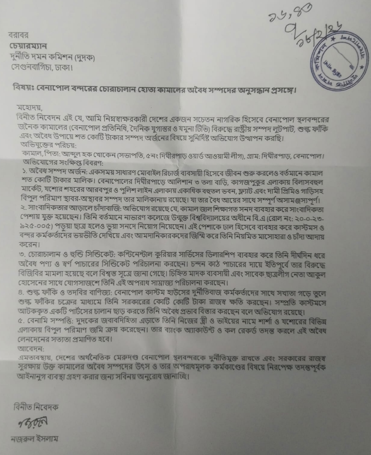 অভিযোগের কেন্দ্রে যা আছে : দুদকে জমা পড়া অভিযোগপত্র ও আমাদের অনুসন্ধানে উঠে এসেছে চাঞ্চল্যকর সব তথ্য। অভিযোগ রয়েছে, কামালের আয়ের প্রধান উৎস শুল্ক ফাঁকি, সোনা চোরাচালান এবং ‘সাংবাদিকতা’র আড়ালে চাঁদাবাজি।