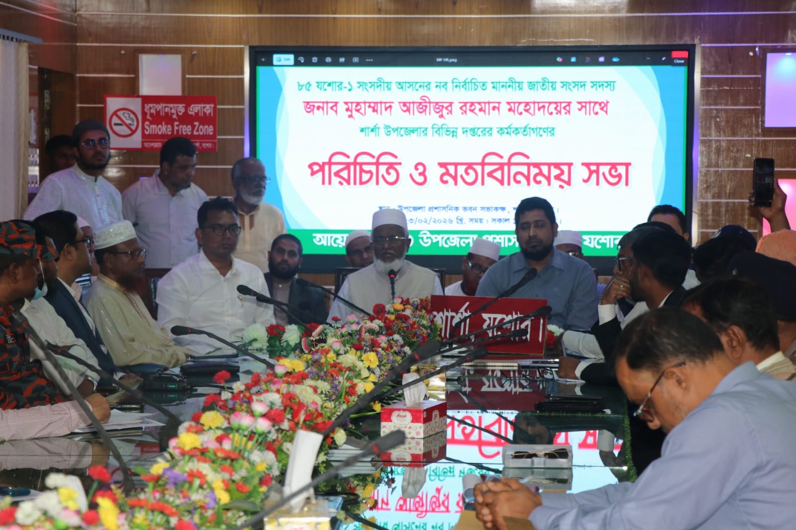 অনুষ্ঠানের শুরুতে উপজেলা প্রশাসনের পক্ষ থেকে নবনির্বাচিত সংসদ সদস্য মাওলানা আজীজুর রহমানকে ফুল দিয়ে শুভেচ্ছা ও অভিনন্দন জানানো হয়।