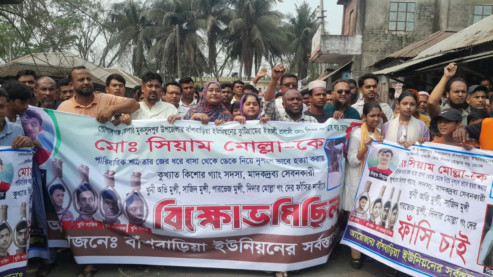 মোঃ সাইফুর রশিদ চৌধুরী. : গোপালগঞ্জের মুকসুদপুরে কলেজ ছাত্র সিয়াম মোল্লাকে (১৭) নৃশংসভাবে হত্যার প্রতিবাদে এবং খুনিদের ফাঁসির দাবিতে ফুঁসে উঠেছে এলাকাবাসী। বুধবার সকালে উপজেলার বাঁশবাড়িয়া ইউনিয়নের বালিয়াকান্দী বাজারে নিহতের পরিবারের সদস্য ও সর্বস্তরের জনগণের অংশগ্রহণে এক বিশাল মানববন্ধন ও বিক্ষোভ মিছিল অনুষ্ঠিত হয়।