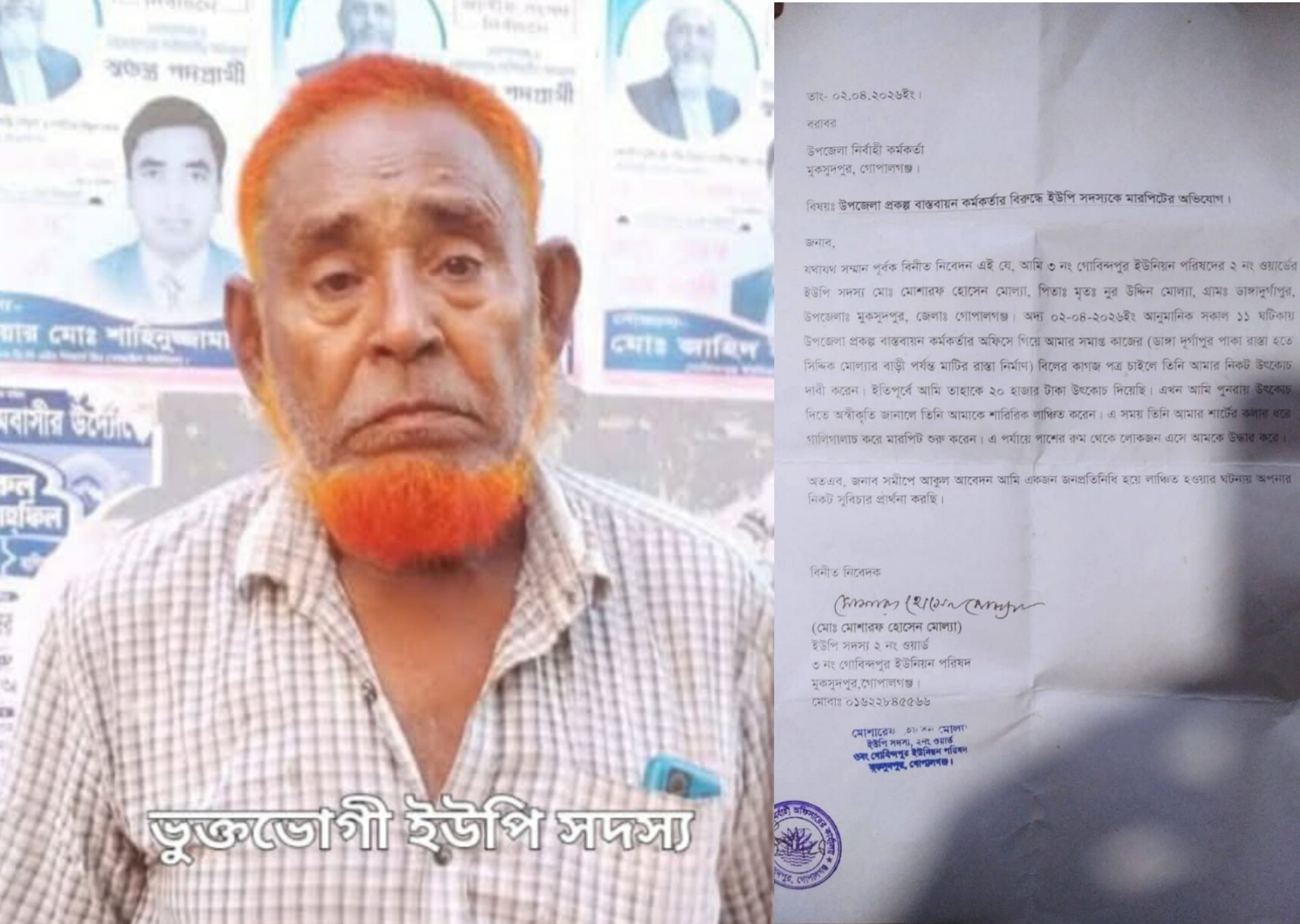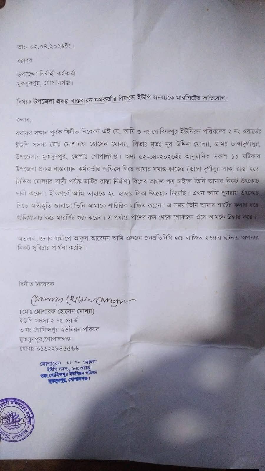 গোপালগঞ্জের  মুকসুদপুরে ঘুষের দাবিতে ইউপি সদস্যকে লাঞ্ছিত করার অভিযোগ পিআইও’র বিরুদ্ধে