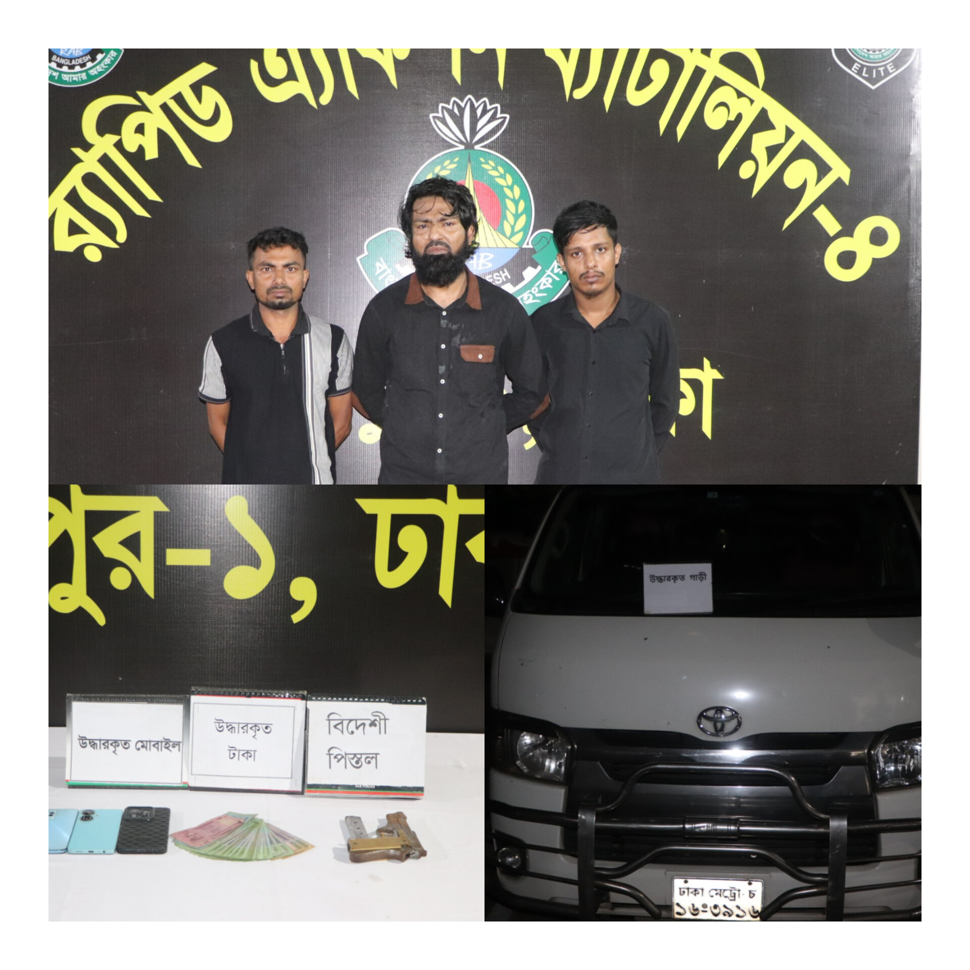 গ্রেফতারকৃতরা হলো মোঃ সাদ্দাম হোসেন শুটার সাদ্দাম (৩২), মোঃ সেলিম (২৮), এবং মোঃ আলভি (৩০)। উক্ত আসামীদের গ্রেফতারকালীন সময়ে আসামী সাদ্দাম হোসেন এর হেফাজত হতে ১টি বিদেশী পিস্তল ও হইচ গাড়ি উদ্ধার করা হয়।