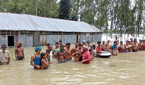 উত্তরাঞ্চল: কুড়িগ্রামের বন্যায় ক্ষতিগ্রস্ত ৯ উপজেলার পানিবন্দি এখন ২ লাখ ৯০ হাজার মানুষ। ৮৯৯ হেক্টর জমির ফসল, ৭১ কিলোমিটার রাস্তা ও ২৭৭ টি শিক্ষা প্রতিষ্ঠান নানাভাবে ক্ষতিগ্রস্ত হয়েছে। লালমনিহাটে ক্ষতিগ্রস্ত হয়েছে ৫ উপজেলা। এখানকার ৯০৯৬টি পরিবার ক্ষতিগ্রস্ত হয়েছে। নীলফামারীর ডিমলা ও জলঢাকা উপজেলার সাড়ে তিন হাজার মানুষ বন্যায় ক্ষতিগ্রস্ত। সরকারি হিসাবে লালমনিরহাটের হাতীবান্ধা, কালীগঞ্জ, আদিতমারী ও সদর উপজেলার ২০ ইউনিয়নের ১৬ হাজার পরিবার বন্যায় ক্ষতিগ্রস্ত হয়েছে। লালমনিরহাটের অতিরিক্ত জেলা প্রশাসক (রাজস্ব) আহসান হাবিব জানান, বন্যাক্রান্ত লোকজনের জন্য এ পর্যন্ত ২৪৫ মেট্রিক টন চাল, শুকনো খাবারের দেড় হাজার প্যাকেট ও সাড়ে চার লাখ টাকা বরাদ্দ দেওয়া হয়েছে। সদর উপজেলার মোগলহাট ইউনিয়ন পরিষদের (ইউপি) চেয়ারম্যান হাবিবুর রহমান হাবিব জানান, ধরলার পানি বৃদ্ধি পাওয়ায় মোগলহাট ইউনিয়নের ফলিমারী, খারুয়া ও ইটাপোতা গ্রামের বেশকিছু এলাকা প্লাবিত হয়েছে। এতে প্রায় এক হাজার পরিবার পানিবন্দি অবস্থায় রয়েছে। কুলাঘাট ইউপি চেয়ারম্যান ইদ্রিস আলী জানান, ধরলা নদীর পানি বৃদ্ধি পাওয়ায় কুলাঘাট ইউনিয়নের বনগ্রাম, শিবেরকুঠি, চর শিবেরকুঠি, বোয়ালমারী চর ও আলোকদীঘি গ্রামের প্রায় সাড়ে তিন হাজার পরিবার পানিবন্দি হয়ে পড়েছে। লালমনিরহাট কৃষি সম্প্রসারণ অধিদপ্তরের উপ-পরিচালক বিধু ভূষণ রায় জানান, বন্যায় জেলার ৩২৫ হেক্টর জমির রোপা আমন ও বীজতলা তলিয়ে গেছে। গাইবান্ধা জেলার ৭ উপজেলার ১ লাখ ৬৬ হাজারেরও বেশি মানুষ ক্ষতিগ্রস্ত হয়েছে বন্যায়। ঘাঘট ও ব্রহ্মপুত্রের পানির তোড়ে গত সোমবার আরও তিনটি বন্যা নিয়ন্ত্রণ বাঁধের বিভিন্ন অংশ ভেঙে গেছে। এতে ৩১টি গ্রাম ও ওইসব এলাকার রাস্তাঘাট এবং ফসল নতুন করে পানিতে ডুবে গেছে। জেলার বন্যাকবলিত চার উপজেলা সুন্দরগঞ্জ, ফুলছড়ি, সাঘাটা ও গাইবান্ধা সদরের ২১৩ গ্রাম প্লাবিত হয়ে লাখো মানুষ পানিবন্দি হয়ে পড়েছেন। বন্যার্তরা বিভিন্ন বাঁধ, আশ্রয় কেন্দ্র, স্কুল ও মসজিদ-মাদ্রাসায় আশ্রয় নিয়েছেন। বিশুদ্ধ খাবার পানির সংকটের সঙ্গে খাদ্য সংকটও দেখা দিয়েছে। গবাদি পশু-পাখি রাখা নিয়ে পড়তে হয়েছে বিপাকে। গাইবান্ধা পানি উন্নয়ন বোর্ডের নির্বাহী পরিচালক মোখলেছুর রহমান জানান, গত সোমবার রাতে ব্রহ্মপুত্রের পানি বিপৎসীমার ১১২ সেন্টিমিটার, ঘাঘট নদীর পানি বিপৎসীমার ৭৪ সেন্টিমিটার ওপর দিয়ে এবং তিস্তার পানি বিপৎসীমার ২ সেন্টিমিটার ওপর দিয়ে প্রবাহিত হচ্ছিল। এদিকে, গত সোমবার ঘাঘট ও ব্রহ্মপুত্রের পানির তোড়ে ভেঙে গেছে চারটি বন্যা নিয়ন্ত্রণ বাঁধের বিভিন্ন অংশ। এরমধ্যে গাইবান্ধা সদরের ঘাঘট নদীর বন্যা নিয
