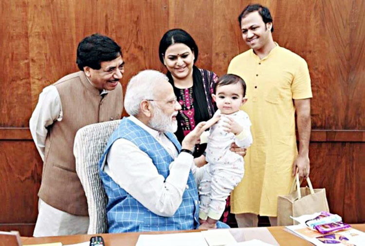 ইন্সটাগ্রামে মোদির পোস্ট করা একটি ছবি দেখে মনে হচ্ছে দাদা যেন তার নাতিকে নিয়ে খেলা করছে। অন্য একটি ছবিতে মোদির কোলে বসে তার ডেস্কে রাখা কাগজপত্র দেখছে শিশুটি। আর মোদি তার দিকে হাসিমুখে তাকিয়ে আছেন। ডেস্কে বেশ কিছু চকলেটও রাখা ছিল।