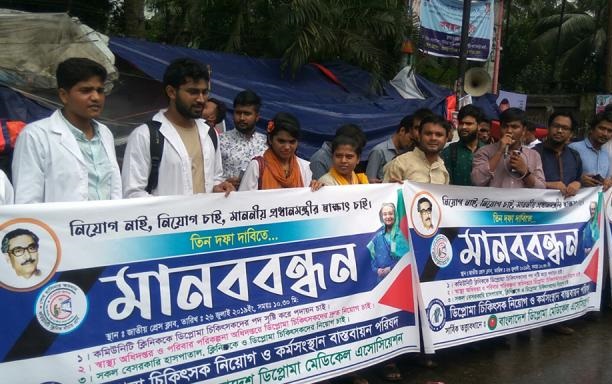 নিজস্ব প্রতিবেদক : উপ-সহকারী মেডিকেল কর্মকর্তা পদ সৃষ্টি ও পদায়নের দাবিসহ তিন দফা দাবিতে মানববন্ধন করেছেন ডিপ্লোমা চিকিৎসক নিয়োগ ও কর্মসংস্থান বাস্তবায়ন পরিষদের সদস্যরা। শুক্রবার জাতীয় প্রেসক্লাবের সামনে এক মানববন্ধন থেকে তারা এসব দাবি জানান। মানববন্ধনে বক্তারা বলেন, স্বাস্থ্য ও পরিবার কল্যাণ মন্ত্রণালয় অনুমোদিত ও রাষ্ট্রীয় চিকিৎসা অনুষদ অধিভুক্ত বর্তমানে সরকারি ৯টি ও বেসরকারি ২০৯টি মেডিকেল অ্যাসিস্ট্যান্ট ট্রেনিং স্কুল রয়েছে। এসব প্রতিষ্ঠানে চার বছর মেয়াদি কোর্স সম্পন্ন করার ব্যবস্থা রয়েছে। ডিপ্লোমা চিকিৎসকরা চাকরির ক্ষেত্রে উপ-সহকারী কমিউনিটি মেডিকেল কর্মকর্তা পদে সুনামের সঙ্গে দীর্ঘদিন ধরে কাজ করে আসছেন। স্বাস্থ্য অধিদফতর ও পরিবার পরিকল্পনা অধিদফতরের অধীনে অনেক শূন্য পদ থাকলেও সেখানে নিয়োগ দেওয়া হচ্ছে না। বক্তারা দাবি জানান, বেসরকারি হাসপাতাল ও ক্লিনিকে ডিপ্লোমা চিকিৎসকদের নিয়োগ দিলে স্বাস্থ্যসেবার মান আরও উন্নত হবে এবং বিশাল জনগোষ্ঠীর বেকারত্ব কাটবে বলে আমরা মনে করি। ডিপ্লোমা চিকিৎসকদের দাবিগুলো হলো -কমিউনিটি ক্লিনিকে ডিপ্লোমা চিকিৎসকদের জন্য উপ-সহকারী কমিউনিটি মেডিকেল কর্মকর্তা পদ সৃষ্টি ও পদায়ন করা, স্বাস্থ্য অধিদফতর ও পরিবার পরিকল্পনা অধিদফতরে উপ-সহকারী কমিউনিটি মেডিকেল কর্মকর্তা শূন্য পদে দ্রুত নিয়োগ ও নতুন পদ সৃষ্টি করা এবং সব বেসরকারি হাসপাতাল-ক্লিনিকে ডিপ্লোমা চিকিৎসকদের উপ-সহকারী কমিউনিটি মেডিকেল কর্মকর্তা পদে নিয়োগ দেওয়া। মানববন্ধনে উপস্থিত ছিলেন সংগঠনের সদস্য সচিব ডাক্তার মো. নাহিদ খন্দকার, আহ্বায়ক ডাক্তার নাজমুল হোসেন এবং সংগঠনের অন্যান্য সদস্যবৃন্দ।