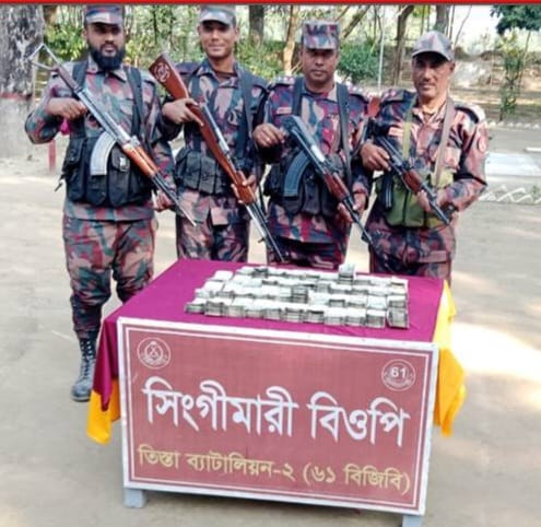 নিজস্ব প্রতিনিধি : আজ মঙ্গলবার ১৯ ডিসেম্বর, দুপুরে বর্ডার গার্ড বাংলাদেশ বিজিবি’র তিস্তা ব্যাটালিয়ন-২ (৬১ বিজিবি) এর অধীনস্থ সিংগীমারী বিওপির টহলদল হাতিবান্ধা উপজেলার সীমান্তবর্তী সিংগীমারী এলাকায় রুটিনমাফিক নিয়মিত টহল দিচ্ছিল। নিয়মিত টহল চলাকালীন সীমান্তের জিরো লাইন এর আনুমানিক ১০০ গজ বাংলাদেশের সিমানার ভেতর সিংগীমারী গ্রামের মৃত এসাহাক মিয়ার ছেলে মোঃ নজরুল ইসলাম (৫০) ও নজরুল […]