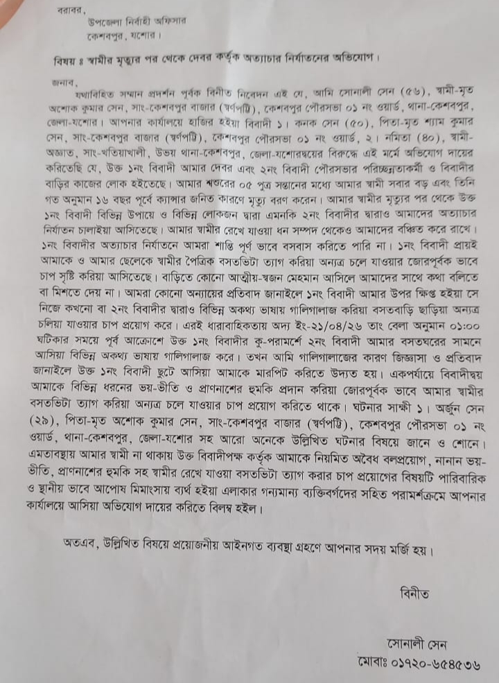 কেশবপুরে দেবরের বিরুদ্ধে বিধবা নারীকে নির্যাতন ও হুমকির অভিযোগ